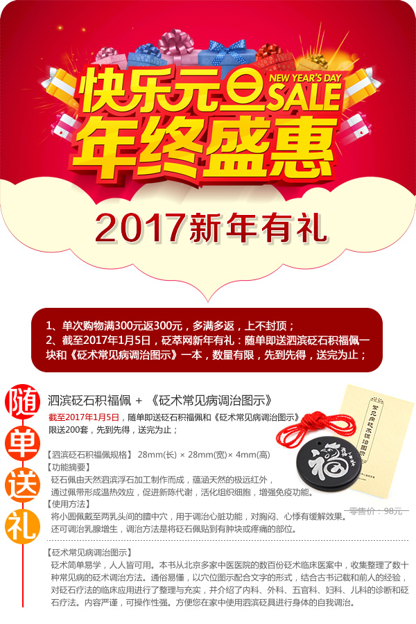 1、截止2017年1月5日,砭萃网新年有礼:随单即送“泗滨砭石积福佩”一块和《常见病砭术调治图示》一本,数量有限,先到先得,送完为止。